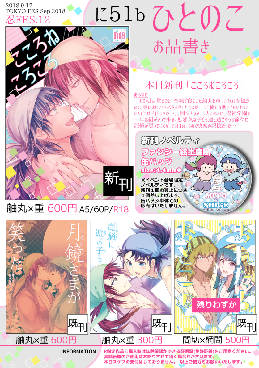 9/17に開催した【忍FES.12】の新刊「こころねころころ」は、とらのあな様にて委託販売中です。
